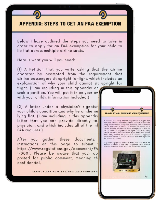 This e-book also includes a separate section dedicated to traveling by cruise ship and the Appendix walks you through the step-by-step process (including a sample petition and doctor's letter) to request an FAA exemption for your child to lie flat across multiple seats if he or she cannot sit upright in flight.